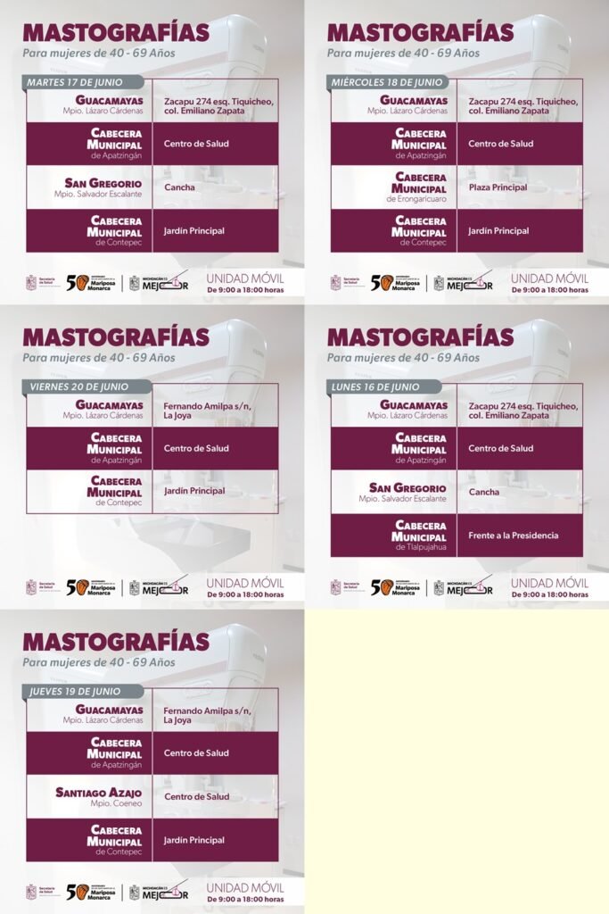 Los municipios de Lázaro Cárdenas, Apatzingán, Salvador Escalante, Tlalpujahua, Contepec, Erongarícuaro y Coeneo serán las sedes para la atención de las mujeres de 40 a 69 años, quienes recibirán el servicio totalmente gratuito en un horario de atención de 9:00 a 18:00 horas.