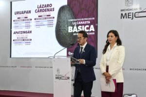 Morelia, Michoacán, 8 de septiembre de 2025.- El titular de la Secretaría de Desarrollo Económico (Sedeco), Claudio Méndez Fernández, informó los resultados del monitoreo semanal de precios de la canasta básica en seis municipios del estado, esta ocasión, el costo más bajo se registró en el tianguis de la Feria de Morelia, con 959 pesos.