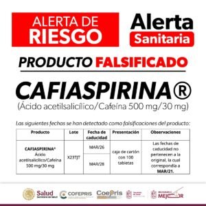 Morelia, Michoacán, 24 de marzo de 2026.- La Comisión Federal para la Protección contra Riesgos Sanitarios (Cofepris), a través de la Secretaría de Salud de Michoacán (SSM), informa a la población sobre la alerta sanitaria respecto a la falsificación del medicamento Cafiaspirina®️ (Ácido acetilsalicílico/Cafeína 500 mg/30 mg).