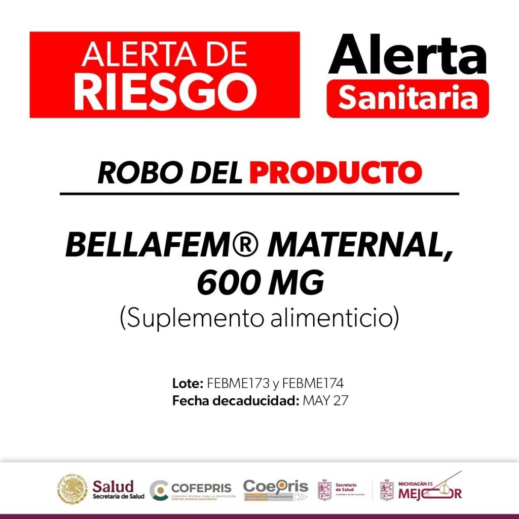 Morelia, Michoacán, 28 de enero de 2026.- La Comisión Federal para la Protección contra Riesgos Sanitarios (Cofepris), a través de la Secretaría de Salud de Michoacán (SSM), informa a la población sobre la alerta sanitaria emitida por el robo del producto Bellafem®️ maternal, suplemento alimenticio de 600 mg, lo que representa un riesgo potencial para la salud.
