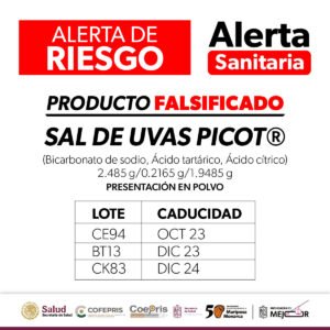 Morelia, Michoacán, 11 de abril de 2025.- La Comisión Federal para la Protección contra Riesgos Sanitarios (Cofepris), a través de la Secretaría de Salud de Michoacán (SSM) informa a la población que se ha identificado la falsificación del producto Sal de Uvas Picot® (Bicarbonato de sodio, Ácido tartárico, Ácido cítrico) en polvo, en presentación de 2.485 g/0.2165 g/1.9485 g.