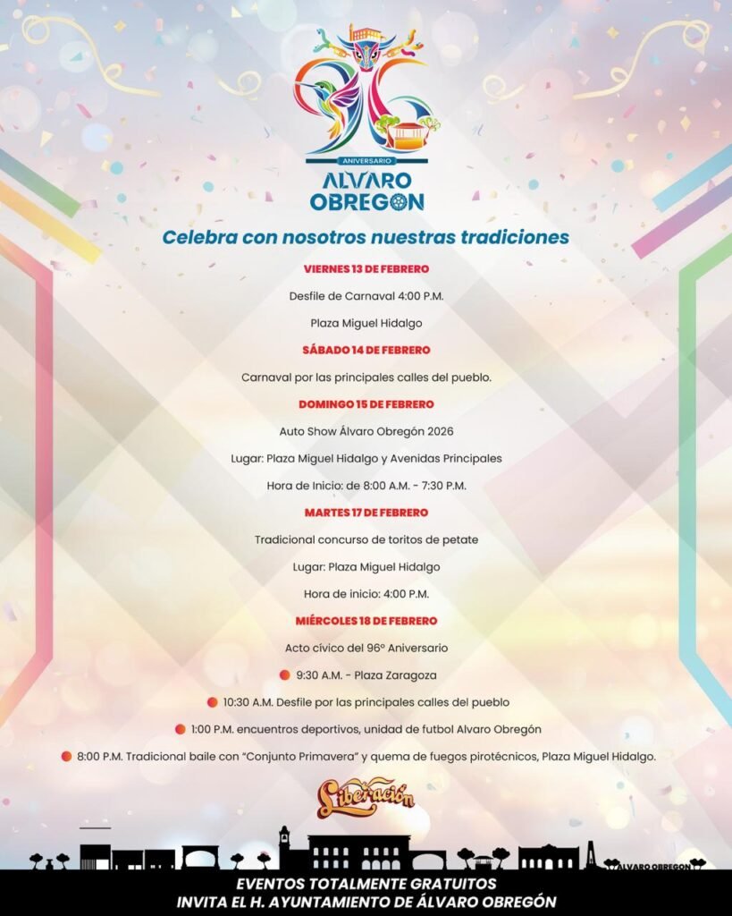 Las actividades iniciarán el 13 de febrero a las 16:30 horas en la Plaza Miguel Hidalgo con el desfile de toritos de petate; el 15 del mismo mes habrá una exhibición de autos por la avenida principal a partir de las 8:00 horas; y el 18 de febrero, a las 9:00 horas, se llevará a cabo un acto cívico por el 96 aniversario de elevación a municipio de Álvaro Obregón.