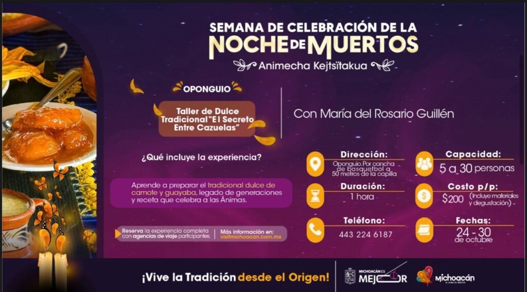 El taller se centrará en la preparación del tradicional dulce de camote y guayaba, un valioso legado de recetas ancestrales preservadas para la Noche de Muertos. La participación en este taller tendrá un costo individual de 200 pesos, monto destinado íntegramente para la tallerista.