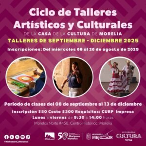 Morelia, Michoacán, 5 de agosto de 2025.- La Secretaría de Cultura de Michoacán (Secum) informa que el periodo de inscripciones para los talleres artísticos y culturales, que se impartirán de septiembre a diciembre en la Casa de la Cultura de Morelia, estará abierto del 6 al 20 de agosto.