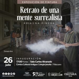 Morelia, Michoacán, 23 de julio de 2025.- El Centro Cultural Antiguo Colegio Jesuita de Pátzcuaro presenta la exposición “Retrato de una mente surrealista”, de la artista michoacana Ariadna Pineda, una propuesta visual profundamente introspectiva que se inaugura el próximo 26 de julio a las 17:00 horas en la Sala Carlos Alvarado Lang, y permanecerá abierta hasta el 12 de octubre con entrada libre.