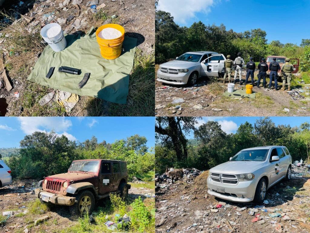 Fue en un camino carretero al norte del municipio donde los elementos de la Guardia Civil, el Ejército Mexicano, la Guardia Nacional y la Policía local, encontraron en aparente estado de abandono dos camionetas de las marcas Jeep y Dodge con leyendas alusivas a un grupo delictivo; al verificar sus datos se pudo constatar que una de ellas tiene reporte de robo.