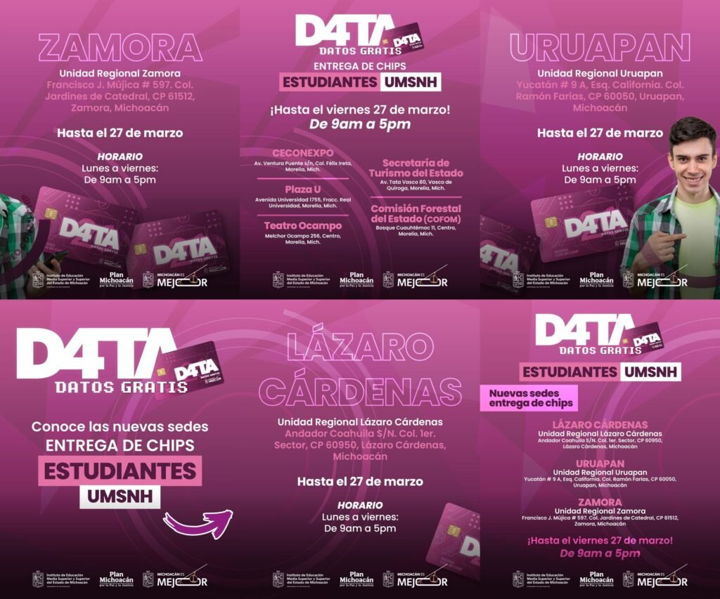 Morelia, Michoacán, 25 de marzo de 2026.- Para acercar los beneficios del Programa D4TA Datos Gratis a todas las regiones del estado, el Instituto de Educación Media Superior y Superior del Estado (Iemsysem) invita a estudiantes de la Universidad Michoacana de San Nicolás de Hidalgo (UMSNH) a conocer y acudir a las sedes habilitadas en el interior del estado para recoger y activar su chip con internet gratuito.