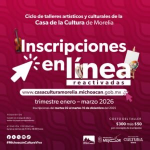 Morelia, Michoacán, 6 de diciembre de 2025.- La Secretaría de Cultura de Michoacán (Secum) anuncia la reactivación de la plataforma digital de inscripciones para los talleres del primer trimestre de 2026 en la Casa de la Cultura de Morelia, con una oferta formativa diversa para todas las edades. El trámite se podrá realizar hasta el 16 de diciembre.