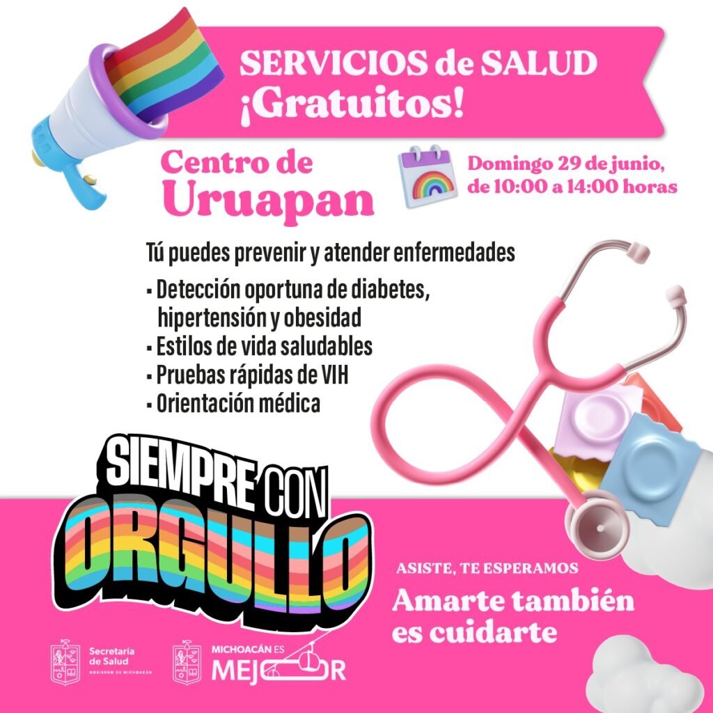 Morelia, Michoacán, 28 de junio de 2025.- En el marco del cierre de las actividades conmemorativas del Mes del Orgullo LGBTTTIQ+, la Secretaría de Salud de Michoacán (SSM) llevará jornadas de salud gratuitas a los municipios de Pátzcuaro, Uruapan y Lázaro Cárdenas.