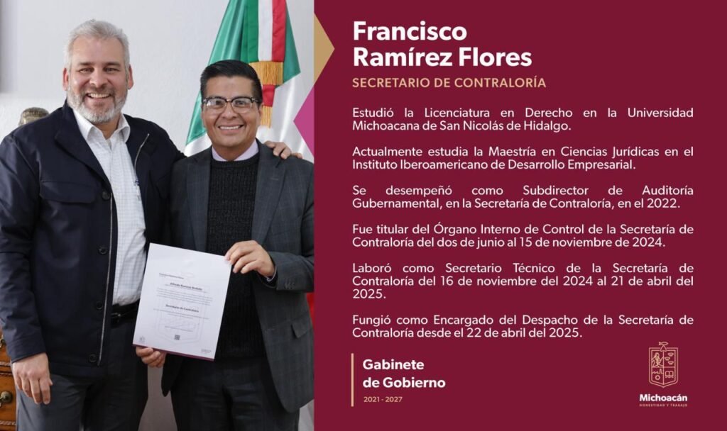 Morelia, Michoacán, 4 de febrero de 2026.- El Congreso del Estado ratificó a Francisco Ramírez Flores como titular de la Secretaría de Contraloría (Secoem). Con este nombramiento, el Gobierno de Michoacán fortalece el trabajo institucional en materia de prevención, control interno y combate a la corrupción, garantizando una fiscalización y rendición de cuentas permanente en favor de la transparencia.