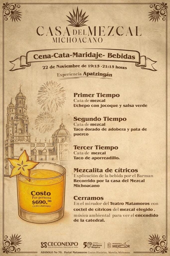 Morelia, Michoacán, 18 de noviembre del 2025.- La Casa del Mezcal Michoacano presentará un evento exclusivo denominado Cena–Cata–Maridaje. Se trata de una nueva experiencia diseñada para la degustación especializada del tradicional mezcal michoacano, armonizada con la gastronomía regional, todo en un ambiente cálido y auténtico.