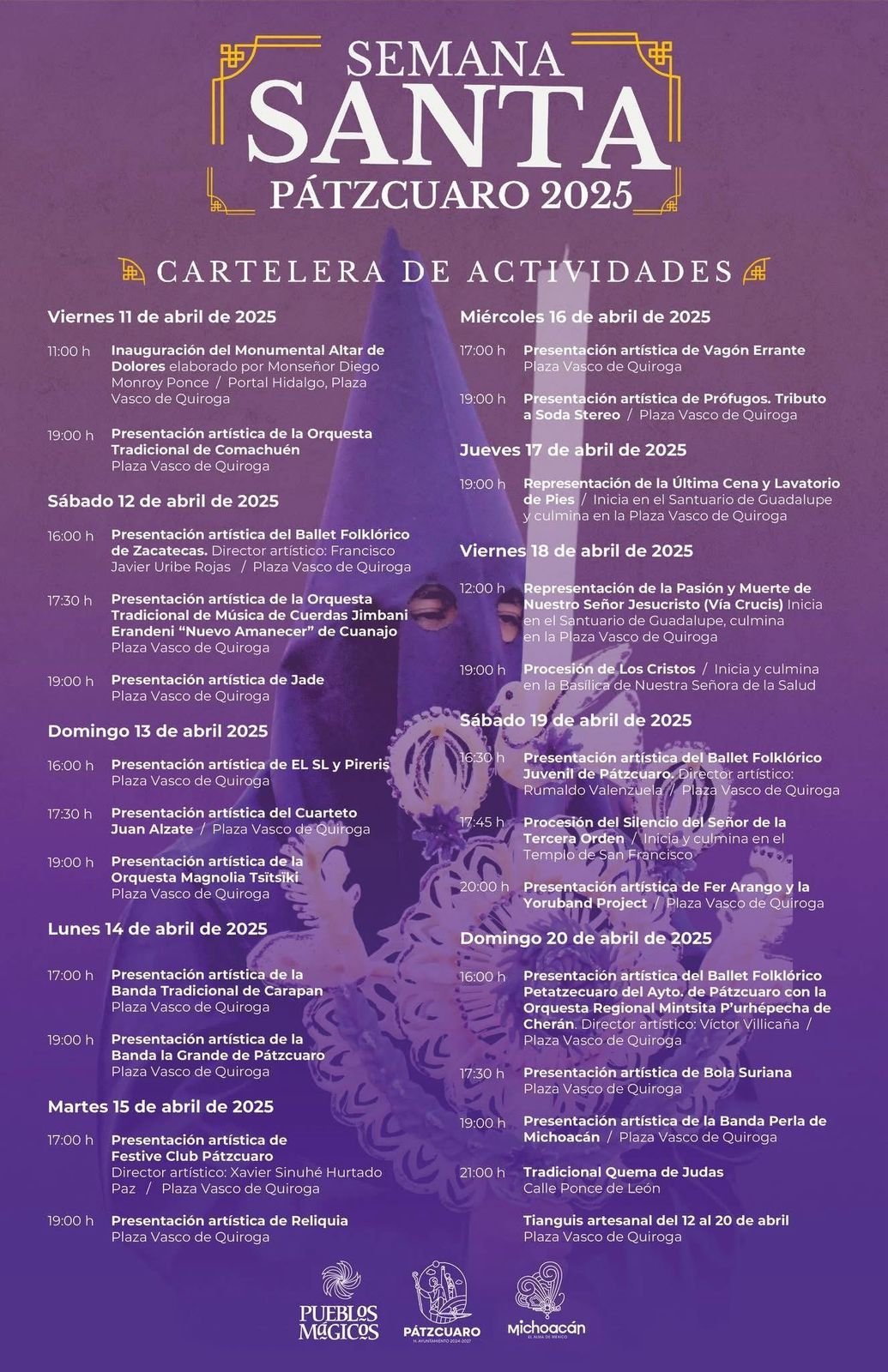 La programación completa puede ser consultada en las redes sociales de la Sectur Michoacán, de igual forma la dependencia estatal recordó que las más de 900 actividades de esta temporada en Michoacán se pueden consultar en el siguiente link: https://visitmichoacan.com.mx/semanasanta-michoacan/