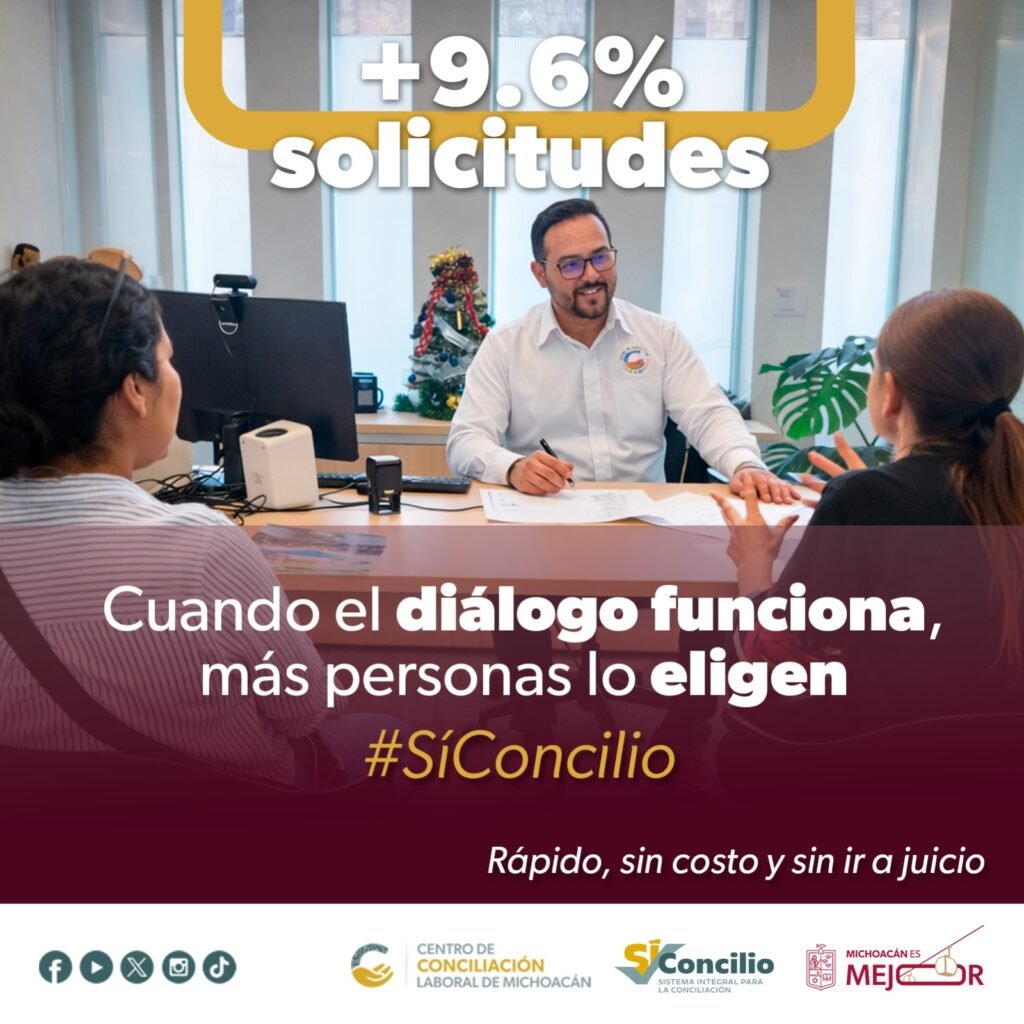 Morelia, Michoacán, 5 de febrero de 2026.- La conciliación laboral en Michoacán se consolida cada vez más como una vía eficaz, accesible y confiable para resolver asuntos entre trabajadoras, trabajadores y empleadores. El Centro de Conciliación Laboral (CCL) del Estado registró un incremento del 9.6 por ciento en el número de solicitudes y ratificaciones atendidas en el periodo más reciente, reflejando una mayor confianza de la ciudadanía en este modelo de justicia laboral basado en el diálogo.