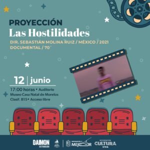 Morelia, Michoacán, 12 de junio de 2025.- La Secretaría de Cultura de Michoacán (Secum) invita a la proyección gratuita del documental “Las Hostilidades”, del director mexicano Sebastián Molina Ruiz, este jueves 12 de junio a las 17:00 horas en el auditorio del Museo Casa Natal de Morelos.