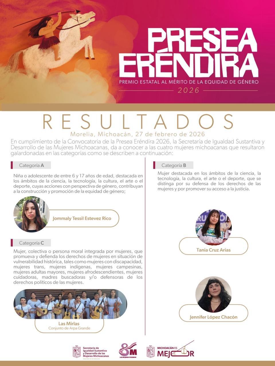 Morelia, Michoacán, 28 de febrero de 2026.- La Secretaría de Igualdad Sustantiva y Desarrollo de las Mujeres Michoacanas (Seimujer) dio a conocer a las ganadoras de la Presea Eréndira 2026, reconocimiento estatal al mérito de la equidad de género que distingue a niñas, adolescentes, mujeres y colectivas cuyas acciones contribuyen a la transformación social y a la defensa de los derechos humanos de las mujeres en el estado.