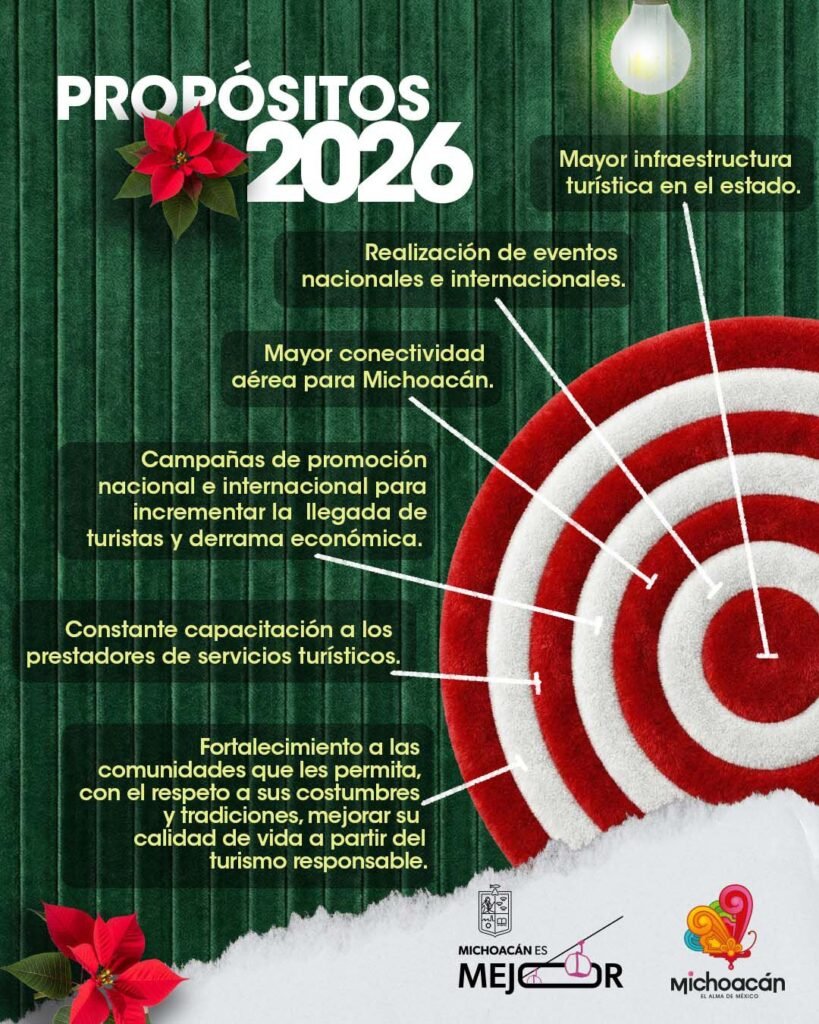 Morelia, Michoacán, 2 de enero de 2026.- El 2026 será un año para cimentar los trabajos del sector turístico en Michoacán, con una mayor conectividad aérea, infraestructura y una fuerte promoción internacional que será vista en diversos eventos de talla mundial como la próxima Feria Internacional de Turismo (Fitur), a realizarse en Madrid, España, del 21 al 25 de enero.