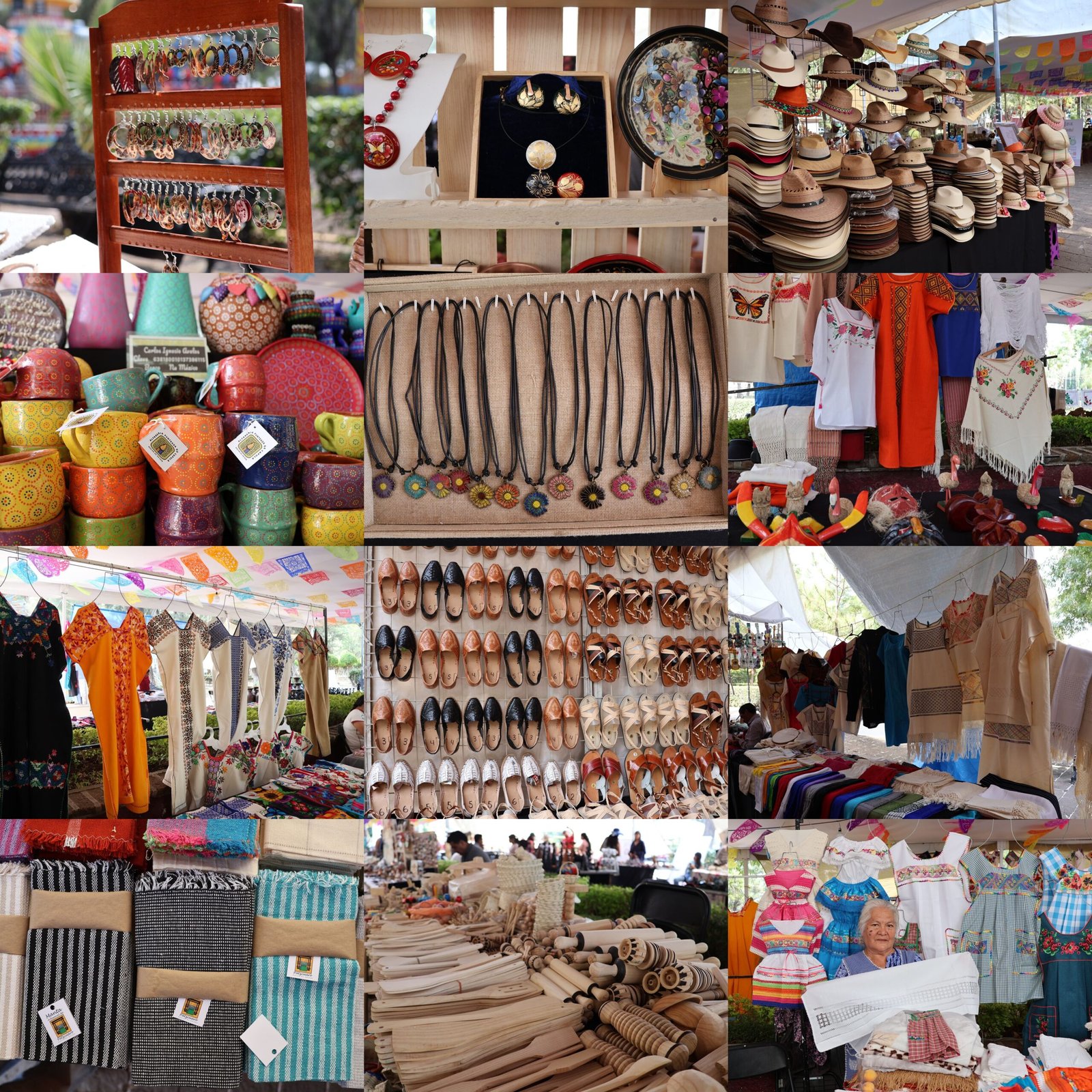 Artesanas y artesanos tienen blusas deshiladas, camisas bordadas, rebozos de algodón, con plumas y de patakua, sombreros, bolsas, zapatos, huaraches, joyería de cobre, barro y vidrio soplado.