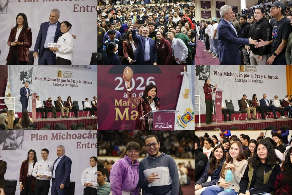 Morelia, Michoacán, 9 de febrero de 2026.- En el Instituto Tecnológico de Morelia, el gobernador Alfredo Ramírez Bedolla inició la entrega de tarjetas de la Beca Gertrudis Bocanegra que beneficiará a más de 44 mil alumnas y alumnos de universidades y tecnológicos públicos para apoyar sus gastos de transporte con mil 900 pesos bimestrales.