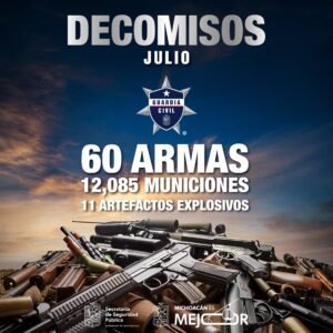 Morelia, Michoacán, 8 de agosto del 2025.- La Secretaría de Seguridad Pública (SSP) en conjunto con autoridades de los tres órdenes de gobierno cerró el mes de julio con el aseguramiento de 60 armas de fuego, 12 mil 085 municiones y 11 artefactos explosivos.