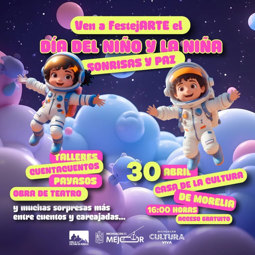 Morelia, Michoacán, 30 de abril de 2025.- La Secretaría de Cultura de Michoacán (Secum) invita a festejar el Día de la Niñez este 30 de abril en la Casa de la Cultura de Morelia, con un día lleno de arte, cuentos, risas y mucha diversión. La entrada es libre para toda la familia.