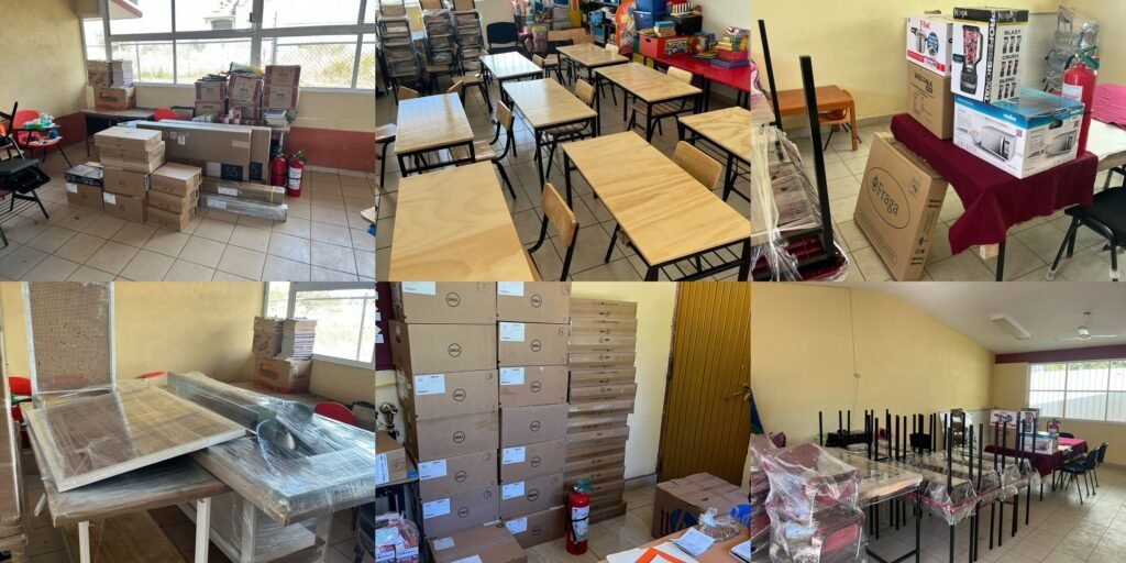 El mobiliario y equipamiento entregado por la dependencia, incluye butacas y mesabancos para el alumnado; escritorios y sillas para el profesorado, pintarrones, archiveros, computadoras, videoproyectores, pantallas retráctiles, impresoras, pizarrones eléctricos interactivos, extintores y cestos metálicos de basura, destinados a aulas y talleres de computación.