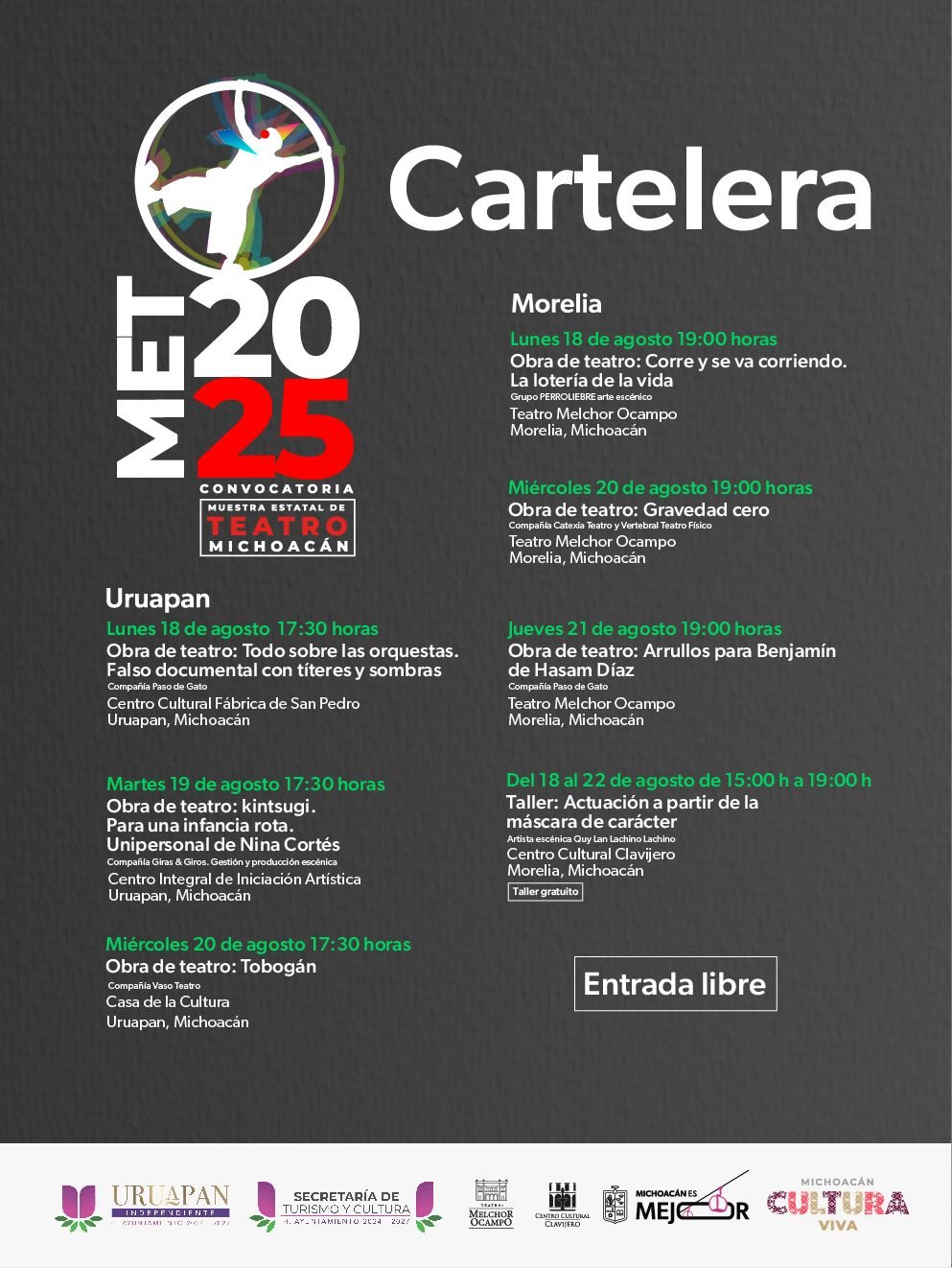 Morelia, Michoacán, 16 de agosto de 2025.- La Secretaría de Cultura de Michoacán (Secum) invita a disfrutar de la Muestra Estatal de Teatro Michoacán 2025, que se realizará del 18 al 22 de agosto en Morelia y Uruapan. Este encuentro busca impulsar el talento escénico local, fortalecer la presencia del teatro en la vida cultural y acercar propuestas artísticas a nuevos públicos.