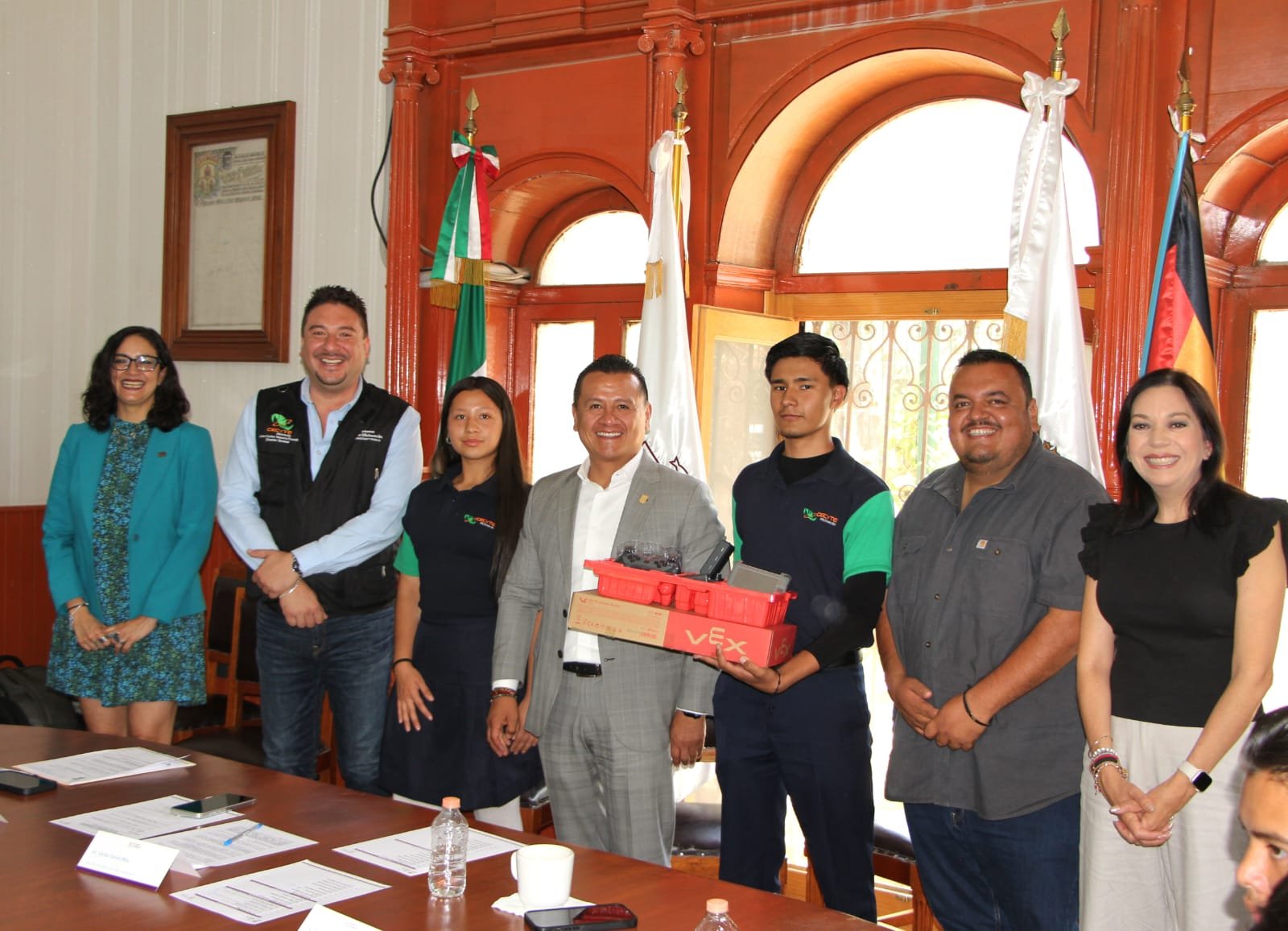 Morelia, Michoacán, 3 de mayo de 2025.- Estudiantes de los planteles de Penjamillo, Lagunillas y Epitacio Huerta del Colegio de Estudios Científicos y Tecnológicos del Estado de Michoacán (Cecytem) fueron abanderados por el secretario de Gobierno, Carlos Torres Piña, para su próxima participación en el Campeonato Mundial de Robótica VEX, a celebrarse en Dallas, Texas, del 6 al 14 de mayo de mayo.