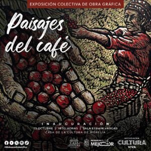 La Secretaría de Cultura de Michoacán invita al público a disfrutar de “Paisajes del café” en la Casa de la Cultura de Morelia ubicada en avenida Morelos Norte 485 en el Centro de Morelia, recinto que continúa siendo un punto de encuentro para diversas manifestaciones artísticas.
