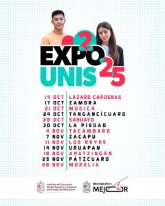 El titular de la Unidad de Planeación y Vinculación del Iemsysem, Aldo Lomelí, detalló que la ExpoUnis 2025 recorrerá los municipios de Lázaro Cárdenas, Zamora, Múgica, Tangancícuaro, Sahuayo, La Piedad, Tacámbaro, Zacapu, Los Reyes, Uruapan, Apatzingán y Pátzcuaro, para culminar con el evento central en Morelia, el próximo 28 de noviembre.