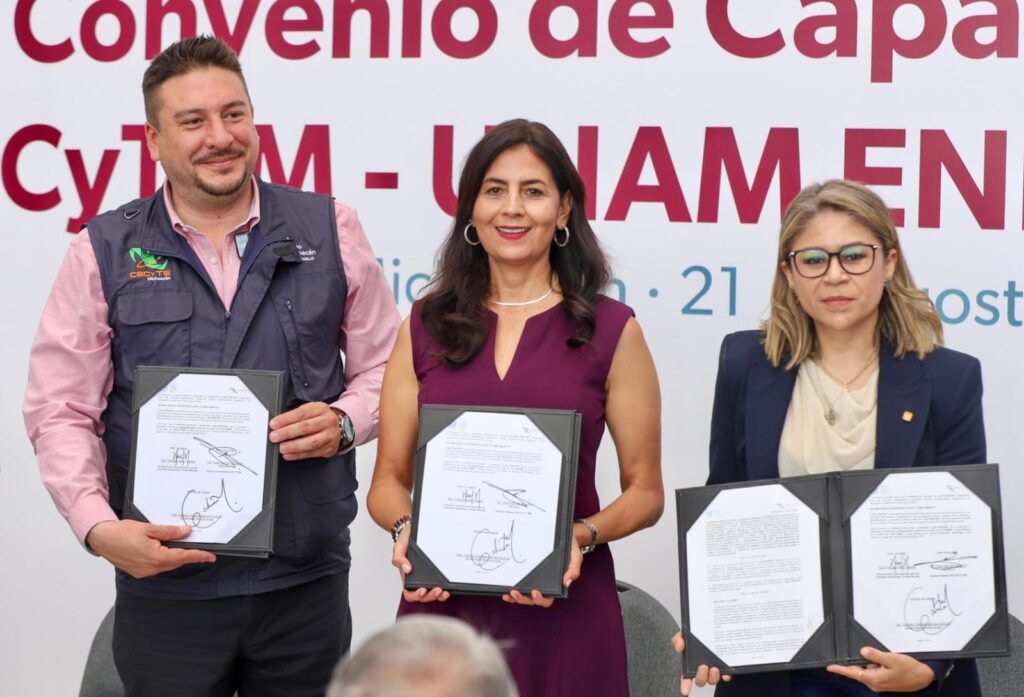 Morelia, Michoacán, 22 de agosto de 2025.- La formación para maestras y maestros es una de las prioridades, destacó la secretaria de Educación, Gabriela Molina, en el marco de la firma de convenio entre el Colegio de Estudios Científicos y Tecnológicos del Estado de Michoacán (Cecytem) y la Escuela Nacional de Estudios Superiores (ENES) Unidad Morelia UNAM.