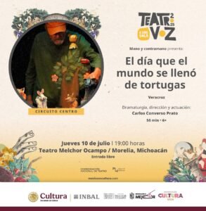 Morelia, Michoacán, 10 de julio de 2025.- Hoy a las 19:00 horas, el Teatro Melchor Ocampo recibirá “El día que el mundo se llenó de tortugas”, una entrañable obra escrita e interpretada por Carlos Converso Prato, con la compañía Mano Contramano, de Veracruz.