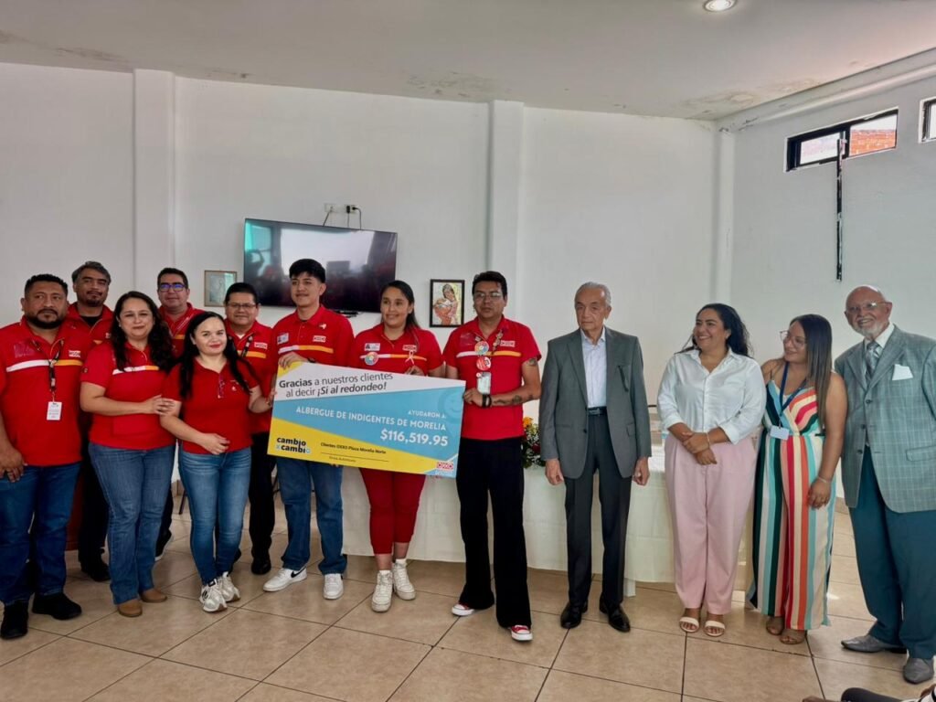 Morelia, Michoacán, 24 de octubre de 2025.- En un esfuerzo conjunto por fortalecer la labor asistencial en Michoacán, Grupo Oxxo a través de su programa “Cambio por Cambio”, entregó un donativo al Albergue de Indigentes de Morelia IAP, institución que atiende diariamente a 50 personas adultas mayores en situación de vulnerabilidad. Este apoyo fue posible gracias a la participación solidaria de los clientes que dijeron sí al redondeo.