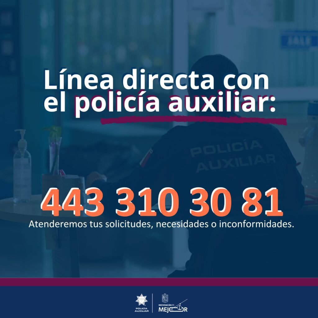 Morelia, Michoacán, 8 de enero de 2026.- Con el objetivo de fortalecer el vínculo con su personal, la Policía Auxiliar habilitó la línea telefónica 443 310 3081, la cual opera desde principios de año. Este canal exclusivo permitirá a las y los elementos expresar solicitudes, necesidades o inconformidades de manera directa y personalizada, optimizando la atención interna de la corporación.
