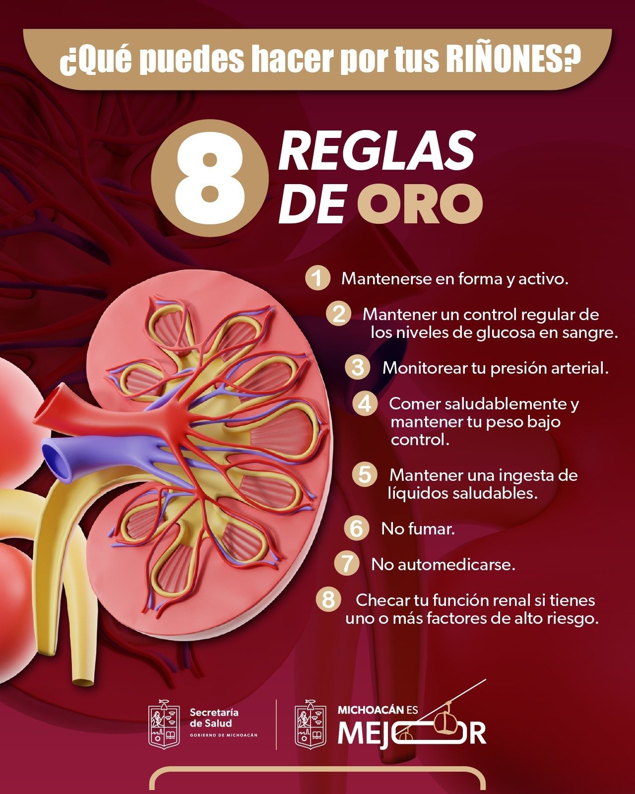 Morelia, Michoacán, 13 de marzo de 2026.- La Secretaría de Salud de Michoacán (SSM) llamó a la ciudadanía a adoptar hábitos saludables que ayuden a prevenir el desarrollo de la Enfermedad Renal Crónica (ERC), en el marco del Día Mundial del Riñón.
