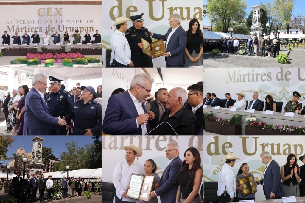 En este marco, el mandatario, acompañado de autoridades de los tres órdenes de gobierno, entregó la Presea Mártires de Uruapan a familiares del policía municipal, Vidal Brígido Guzmán, fallecido en cumplimiento de su deber; a la Secretaría de Seguridad Pública, Tránsito y Vialidad Municipal; y a los agentes locales heridos en cumplimiento de su deber, Daniela Arévalo, Yanuaria Rodríguez y Hugo Caro.