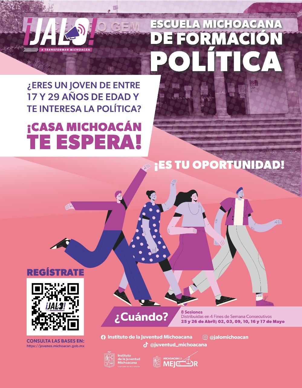 Morelia, Michoacán, 16 de abril de 2025.- Con la finalidad de garantizar la correcta formación política de las y los jóvenes de Michoacán, el Instituto de la Juventud Michoacana llevará a cabo la primera edición de la Escuela Michoacana de Formación Política, como parte del programa Jalo a Transformar Michoacán.