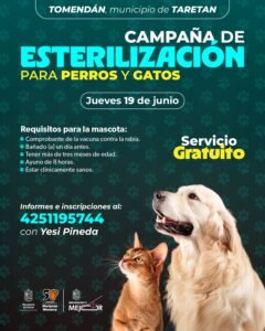 Las jornadas se llevarán a cabo el miércoles 18 de junio, en el auditorio de la comunidad de Caltzontzin, municipio de Uruapan, para lo cual, las y los interesados en esterilizar a sus mascotas pueden acudir al Centro de Salud para el registro. El jueves 19 de junio, en la comunidad de Tomendán, municipio de Taretan. Para informes y registro las personas se pueden comunicar al teléfono 425 119 5744.