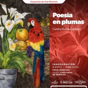Morelia, Michoacán, 5 de marzo de 2026.- La Secretaría de Cultura de Michoacán (Secum) invita a la inauguración de la exposición de arte plumario “Poesía en Plumas”, de la artista Caritina Muñoz Calderón, que se realizará en el Museo Casa Natal de Morelos el próximo 6 de marzo a las 18:00 horas.