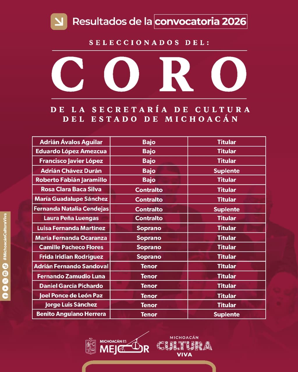 Morelia, Michoacán, 25 de febrero de 2026.- La Secretaría de Cultura de Michoacán (Secum) dio a conocer los resultados de la convocatoria del Coro de la Secum 2026, agrupación que representará al estado durante este año en diversas actividades artísticas y culturales.