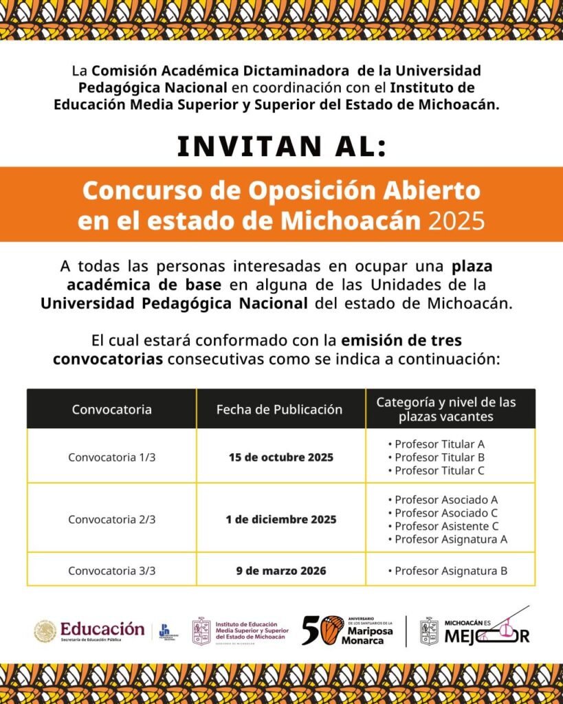 Ante directivos, docentes y estudiantes de las unidades UPN Morelia, Zitácuaro y Uruapan, la directora general del Iemsysem, Mariana Sosa Olmeda, anunció que a partir de este miércoles 15 de octubre se emitirá la primera de tres convocatorias abiertas y transparentes, que permitirán a 83 profesionales de la educación incorporarse a las diferentes unidades del estado con certeza y estabilidad laboral, mediante plazas con clave federal.