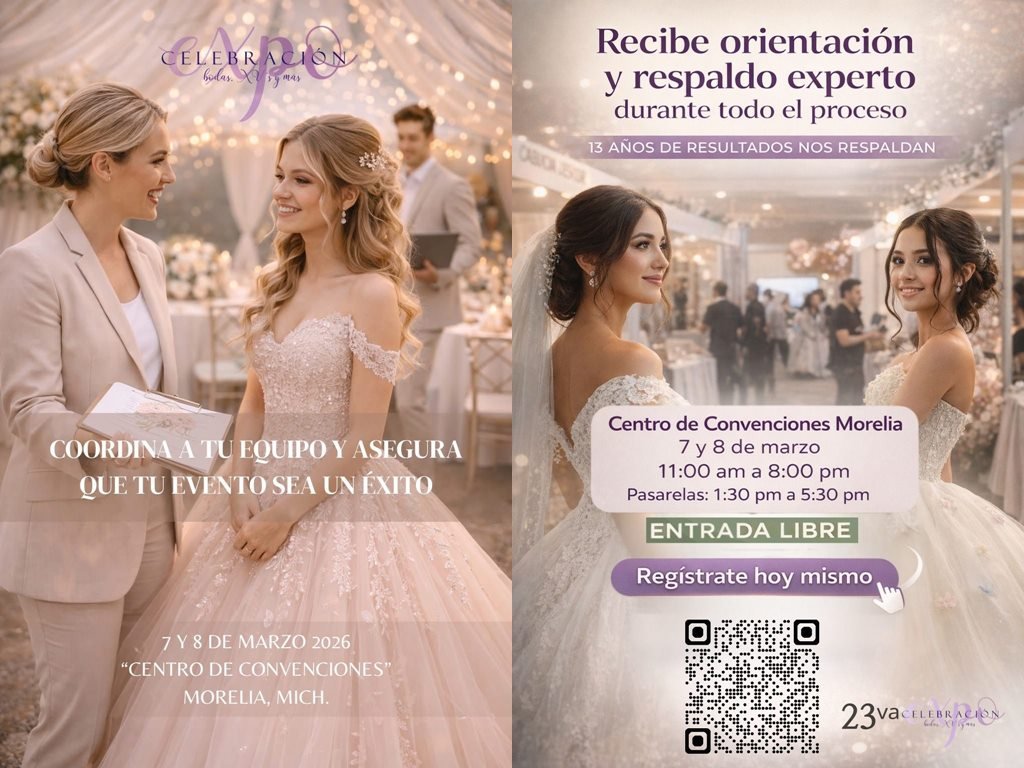 Morelia, Michoacán, 26 de febrero de 2026.- La Expo Celebración, Bodas, XV´s y más ofrecerá una amplia gama de vestidos, servicios y proveedores especializados, informó la Secretaría de Turismo de Michoacán (Sectur), dependencia dirigida por Roberto Monroy García.