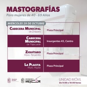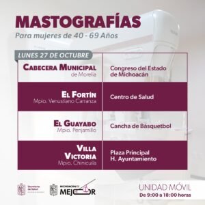 Morelia, Michoacán, 27 de octubre de 2025.- La Secretaría de Salud de Michoacán (SSM) cierra el Mes de Sensibilización sobre el Cáncer de Mama con el despliegue de unidades móviles de mastografías del 27 al 31 de octubre, para atender a mujeres de 40 a 69 años en 10 municipios.