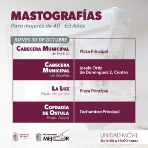 MASTOGRAFÍAS GRATUITAS LLEGAN A 10 MUNICIPIOS DEL 27 AL 31 DE OCTUBRE: SSM