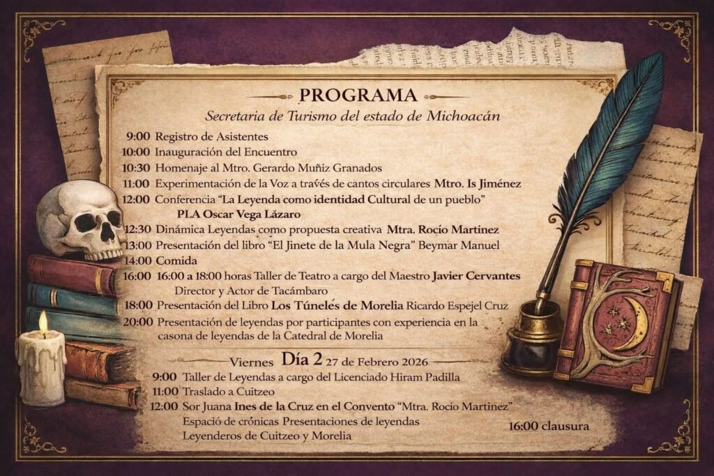 Morelia, Michoacán, 18 de febrero de 2026.- Morelia será sede de la segunda edición del Encuentro de Narradores de Leyendas, que se realizará el 26 y 27 de febrero en el auditorio de la Secretaría de Turismo estatal (Sectur), ubicado en la avenida Tata Vasco número 80, colonia Vasco de Quiroga, informó su titular Roberto Monroy García.