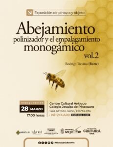 Morelia, Michoacán, 19 de marzo de 2026.- La Secretaría de Cultura de Michoacán (Secum) invita a la inauguración de la exposición de pintura y objeto “Abejamiento polinizador y el empalagamiento monogámico vol. 2”, del artista Rodrigo Treviño (Rotre), que se llevará a cabo el sábado 28 de marzo a las 17:00 horas en la Sala Alfredo Zalce del Centro Cultural Antiguo Colegio Jesuita de Pátzcuaro. La entrada será libre.