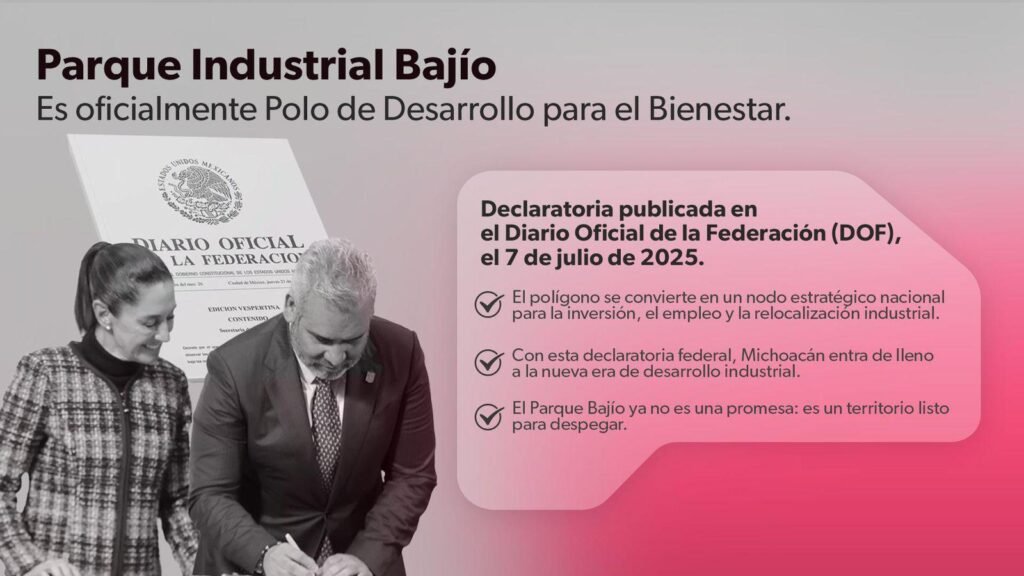 Morelia, Michoacán, 15 de julio de 2025.- El Parque Industrial Bajío, ubicado en el municipio de Zinapécuaro, fue oficialmente designado como Polo de Desarrollo Económico para el Bienestar (Podebi). Así lo informó Claudio Méndez Fernández, titular de la Secretaría de Desarrollo Económico (Sedeco), tras la publicación del acuerdo en el Diario Oficial de la Federación (DOF) el pasado 7 de julio.
