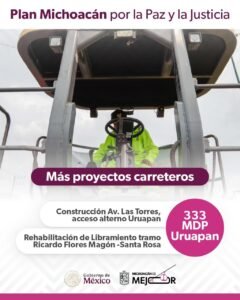 Entre las acciones que se realizan está la construcción de la avenida Las Torres, como vía de acceso alterno a Uruapan, y la tercera etapa de la avenida Revolución. También se ejecutarán cuatro obras de rehabilitación de infraestructura vial en el bulevar Industrial, entre calle República del Salvador y calzada de La Fuente; del libramiento, en los tramos Puente La Papelera-La Hielera y Ricardo Flores Magón-Santa Rosa; al igual que de la avenida Lázaro Cárdenas.