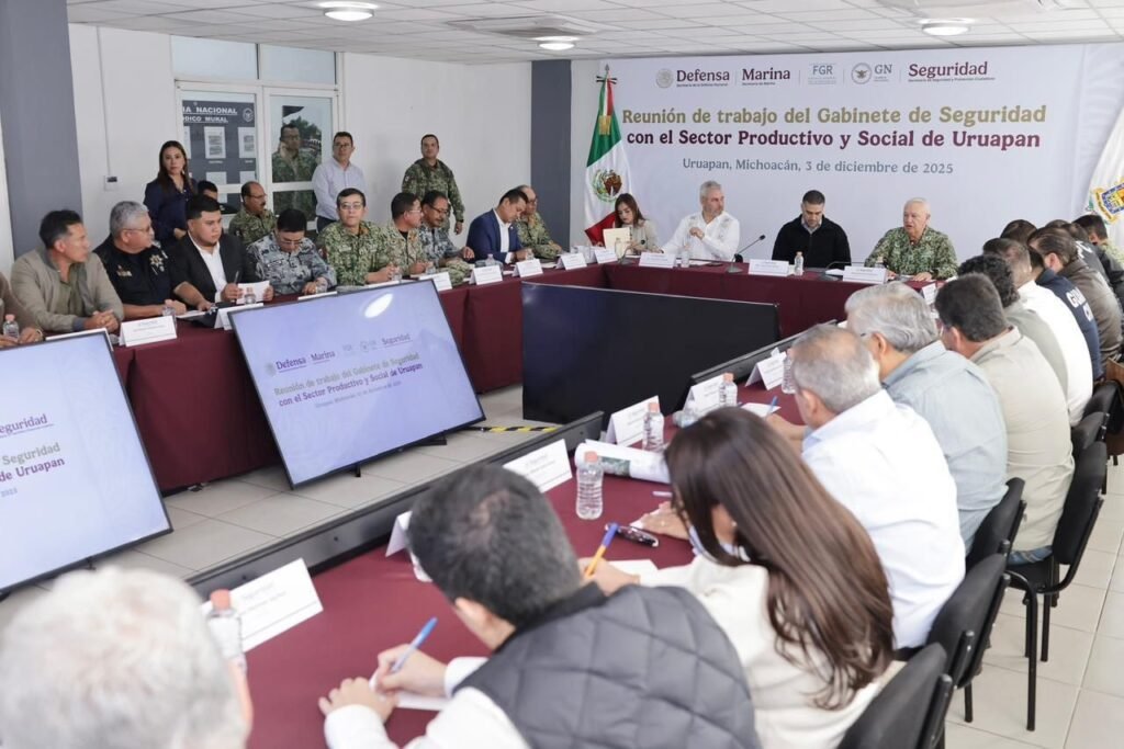 Uruapan, Michoacán, 3 de diciembre de 2025.- El gobernador Alfredo Ramírez Bedolla; el secretario de Seguridad y Protección Ciudadana del Gobierno de México, Omar García Harfuch, y el general Ricardo Trevilla Trejo de la Defensa Nacional, encabezaron reunión de seguimiento a las acciones de seguridad del Plan Uruapan con la participación de la presidenta municipal, Grecia Quiroz y el sector productivo.
