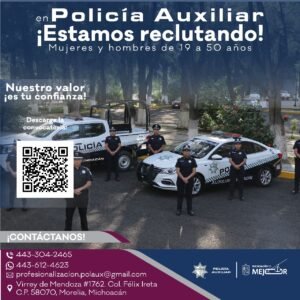 “Si tienes entre 19 y 50 años de edad, vocación de servicio, compromiso y valor, esta es tu oportunidad para integrarte a las filas de la Policía Auxiliar de Michoacán y coadyuvar en las tareas de seguridad garantizando la tranquilidad de nuestra sociedad”. La oferta es de 100 vacantes para mujeres y hombres en Morelia, Lázaro Cárdenas y Zamora.