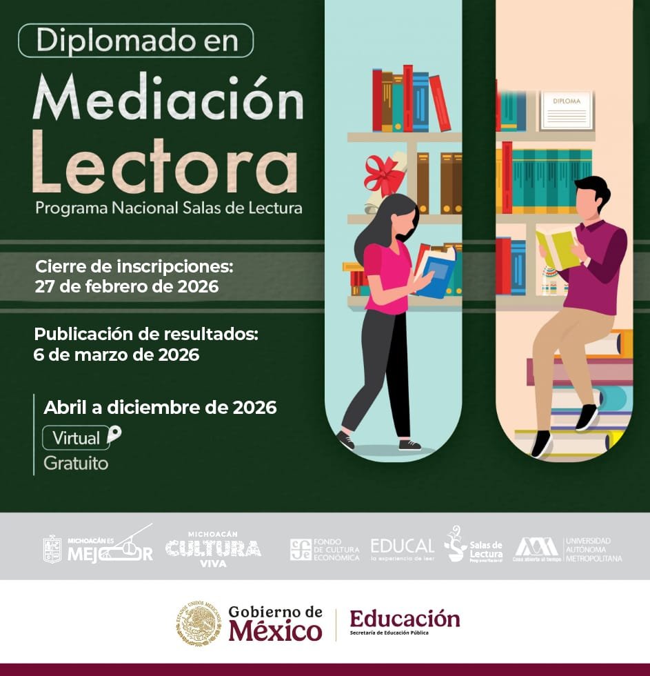 Morelia, Michoacán, 23 de enero de 2026.- La Secretaría de Cultura de Michoacán (Secum), en coordinación con el Fondo de Cultura Económica (FCE), la Universidad Autónoma Metropolitana Unidad Xochimilco (UAM-X) y el Programa Nacional Salas de Lectura, convoca a participar en el Diplomado en Mediación Lectora 2026.